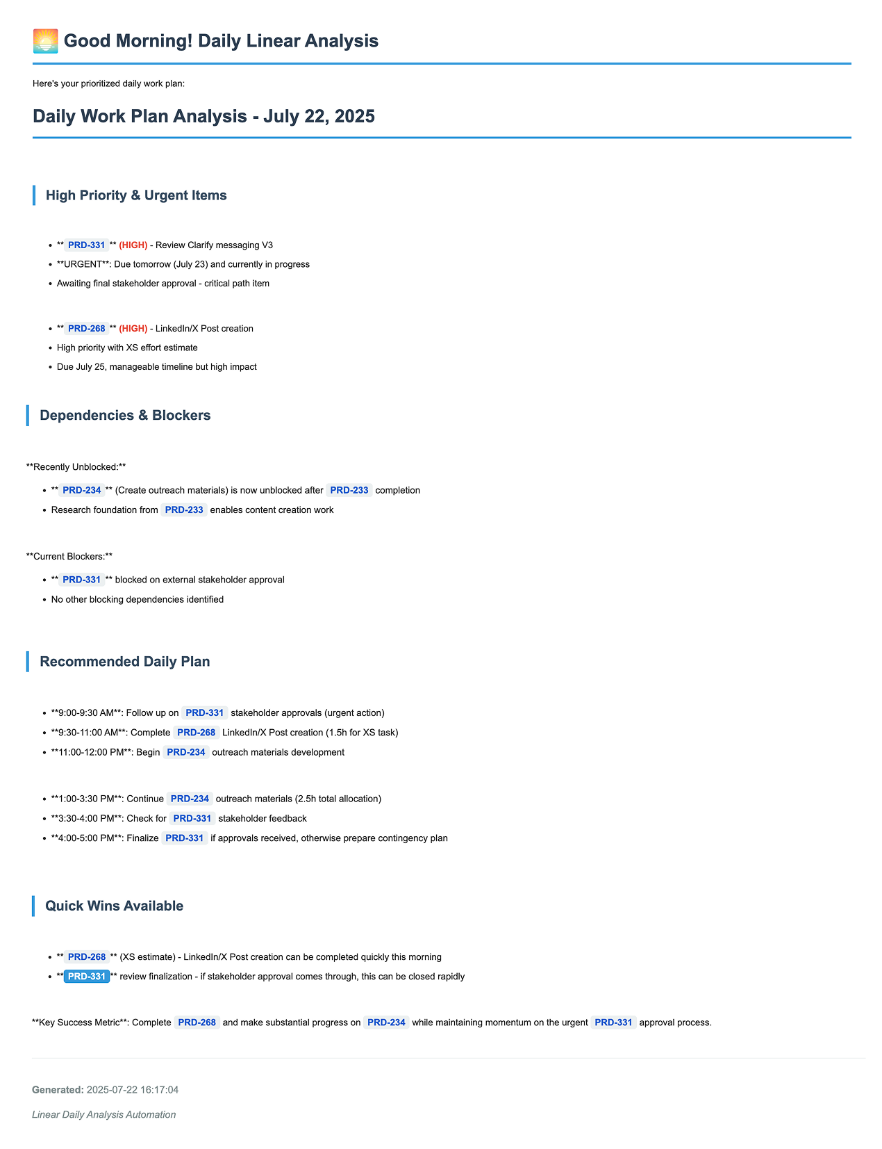 I decided to automate this entire process using Claude AI and Linear's new MCP (Model Context Protocol) server. Now, every weekday at 7 AM, I get an email with: